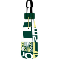 Чехол на бутылку с вывязанным логотипом и индивидуальным рисунком в фирменной цветовой гамме.